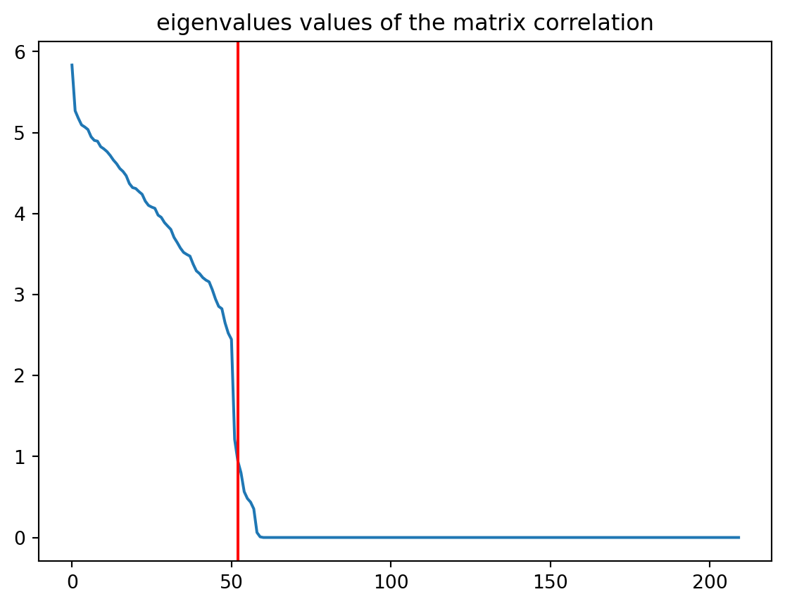 We notice that only the first 60 values are (significantly) different from 0. This means that the design matrix is rank-deficient (60 < 210). Thus attempting a ‘’PCA before OLS’’ strategy is legitimate. We record the index of the last non-zero eigenvalue.