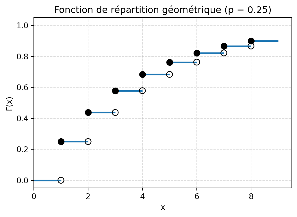 import numpy as npimport matplotlib.pyplot as pltdef plot_cdf_geometrique(p=0.3, k_max=8):""" Trace la fonction de répartition F_X(x) = 0 si x < 1 = 1 - (1-p)^k si k <= x < k+1 pour k = 1,2,... avec une troncature à k_max. """ifnot (0< p <1):raiseValueError("p doit être dans l'intervalle (0, 1).") plt.figure(figsize=(6, 4))# Segment avant 1 : F(x) = 0 pour 0 <= x < 1 plt.hlines(0, 0, 1, linewidth=2)# Segments horizontaux pour k = 1,...,k_maxfor k inrange(1, k_max +1): level =1- (1- p)**k plt.hlines(level, k, k +1, linewidth=2)# Points ouverts (limite à gauche, non incluse) x_open, y_open = [], []# Points fermés (valeur de la FDR) x_closed, y_closed = [], []for k inrange(1, k_max +1):# Limite à gauche en k :if k ==1: left_limit =0else: left_limit =1- (1- p)**(k -1) value_at_k =1- (1- p)**k x_open.append(k) y_open.append(left_limit) x_closed.append(k) y_closed.append(value_at_k)# Cercles ouverts (non remplis) : limite à gauche plt.scatter( x_open, y_open, facecolors="none", edgecolors="black", s=60, zorder=3 )# Cercles fermés (remplis) : valeur de F_X en k plt.scatter( x_closed, y_closed, color="black", s=60, zorder=3 )# Mise en forme plt.xlabel("x") plt.ylabel("F(x)") plt.title(f"Fonction de répartition géométrique (p = {p})") plt.xlim(0, k_max +1.5) plt.ylim(-0.05, 1.05) plt.grid(True, linestyle="--", alpha=0.4) plt.show()# Exemple d'appelplot_cdf_geometrique(p=0.25, k_max=8)