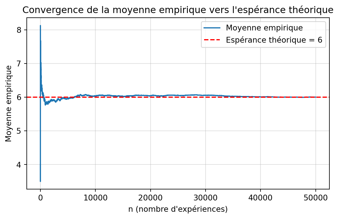 import randomimport numpy as npimport matplotlib.pyplot as plt# Répétition de l'expériencerandom.seed(360)n =50000simlist = []for _ inrange(n): trial =0# valeur du lancer nb_tent =0# nombre de tentativeswhile trial !=6: nb_tent +=1 trial = random.randint(1, 6) # équivalent de sample(1:6,1) simlist.append(nb_tent)simlist = np.array(simlist)# Résultatsprint("\n=== Résultats de la simulation ===")print("Nombre de simulations:", n)print("Moyenne du nombre de lancers:", simlist.mean())print("Variance:", simlist.var(ddof=1))print("Écart-type:", simlist.std(ddof=1))print("Minimum:", simlist.min())print("Maximum:", simlist.max())print("Médiane:", np.median(simlist))# Calcul des moyennes cumuléesmean_values = np.cumsum(simlist) / np.arange(1, n +1)# Tracéplt.figure(figsize=(7, 4))plt.plot(mean_values, label="Moyenne empirique")plt.axhline(6, color="red", linestyle="--", label="Espérance théorique = 6")plt.xlabel("n (nombre d'expériences)")plt.ylabel("Moyenne empirique")plt.title("Convergence de la moyenne empirique vers l'espérance théorique")plt.legend()plt.grid(alpha=0.4)plt.show()
