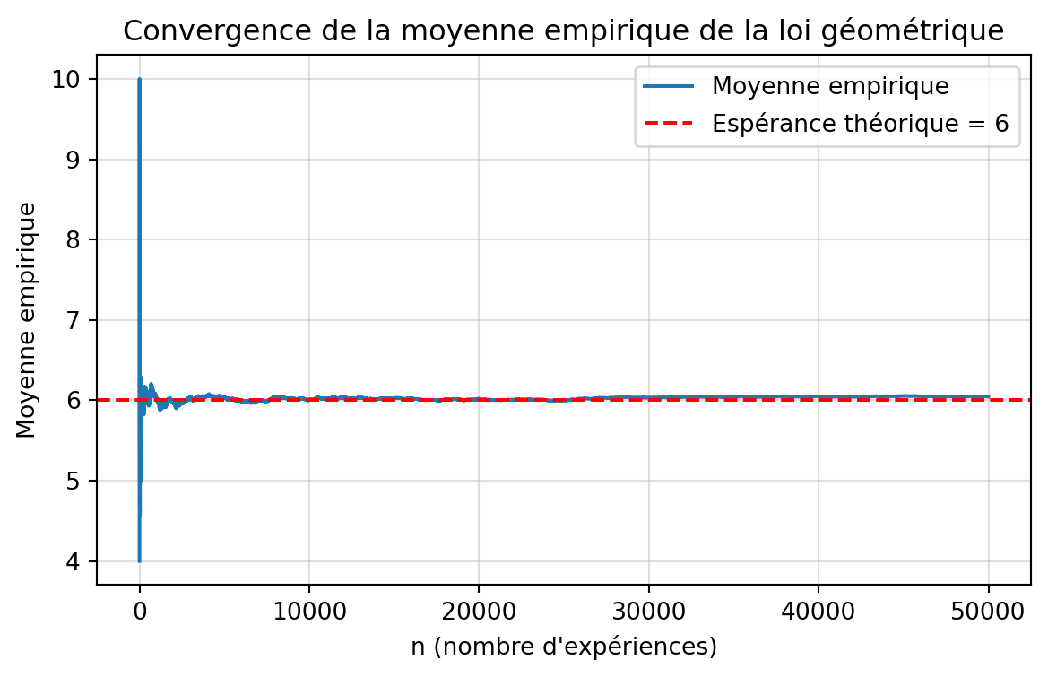 import numpy as npimport matplotlib.pyplot as pltimport scipy.stats as st# Paramètresnp.random.seed(360)n =50000p =1/6# La loi géométrique de R donne "nombre d'échecs avant succès"# => équivalent python : st.geom(p).rvs() renvoie déjà nb_tentatives# MAIS Python compte à partir de 1, donc c'est ce qu’on veut !simlist = st.geom(p).rvs(size=n)# Affichage des résultatsprint("\n=== Résultats de la simulation (méthode géométrique) ===")print("Nombre de simulations:", n)print("Probabilité de succès p:", p)print("Moyenne observée:", simlist.mean())print("Moyenne théorique:", 1/p)print("Variance observée:", simlist.var(ddof=1))print("Variance théorique:", (1- p) / p**2)print("Écart-type observé:", simlist.std(ddof=1))print("Médiane:", np.median(simlist))# Moyennes cumuléesmean_values = np.cumsum(simlist) / np.arange(1, n +1)# Tracéplt.figure(figsize=(7, 4))plt.plot(mean_values, label="Moyenne empirique")plt.axhline(1/p, color="red", linestyle="--", label=f"Espérance théorique = {1/p:.0f}")plt.xlabel("n (nombre d'expériences)")plt.ylabel("Moyenne empirique")plt.title("Convergence de la moyenne empirique de la loi géométrique")plt.legend()plt.grid(alpha=0.4)plt.show()